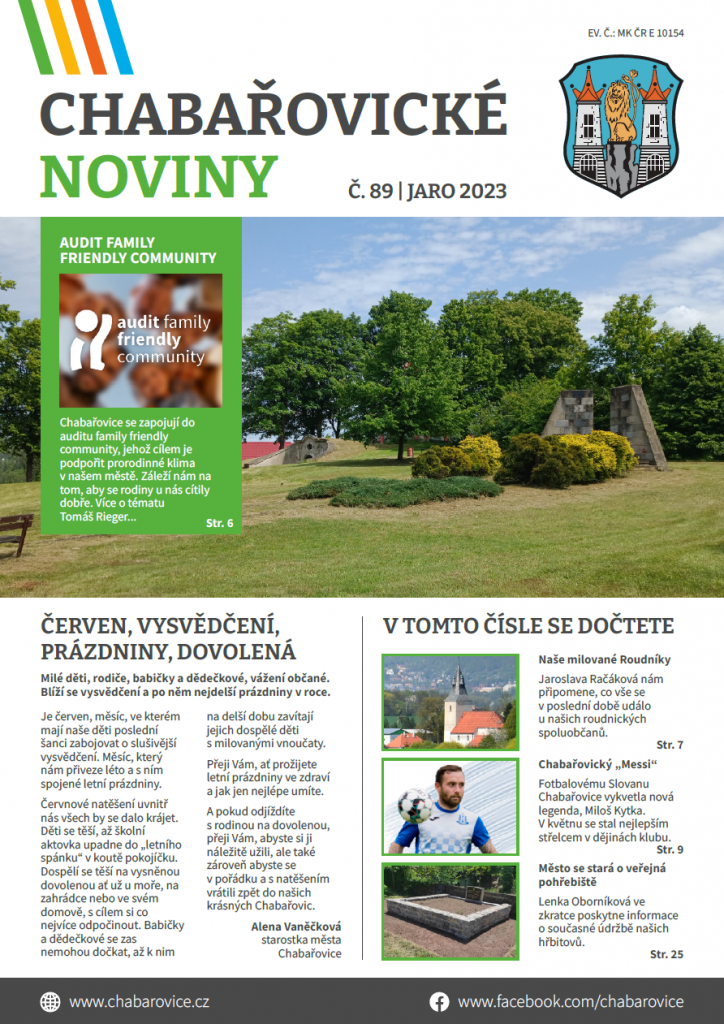 Vážení občané, přinášíme Vám nové číslo, tentokrát jarních, Chabařovických novin. Přejeme příjemné čtení :)