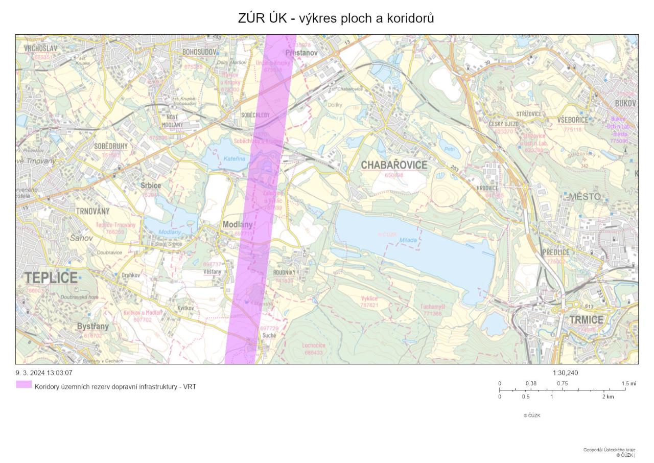 V roce 2011 vymezil Ústecký kraj (ÚK) ve svém „územním plánu“, v tzv. Zásadách územního rozvoje ÚK (ZÚR), jako územní rezervu na základě návrhů první studie z r. 2005 koridor široký 600 m pro vedení budoucí vysokorychlostní tratě Praha – hranice CZ/DE – viz obrázek. Původní studie nepočítala se zastávkou v Ústí n. L. Tento stav byl následně v roce 2017 přehodnocen a začalo se hledat řešení, které by krajské město nevynechávalo. Stát navrhoval na stávající trase vybudovat u Chabařovic terminál s velkým parkovištěm, který by krajské město obsluhoval. S tím UL nesouhlasilo a chtělo terminál přímo ve městě. Navíc toto řešení nevyhovělo dopravním požadavkům z hlediska žádoucích časových dostupností jednotlivých měst (Drážďany, Ústí nad Labem). Od původní trasy vedené mimo Ústí nad Labem bylo definitivně ustoupeno na základě Studie proveditelnosti nového železničního spojení Praha – Drážďany schválené 22. 12. 2020 Centrální komisí Ministerstva dopravy (MD). Mezitím hledá Správa železnic (SŽ) od r. 2014 další možné trasy, kudy by VRT prošla územím, geografická poloha Ústí nad Labem a morfologie terénu zde ani v okolí však nenabízí řešení, které by bylo bez problémů a nutných kompromisů. SŽ coby investor VRT nakonec jednu trasu našla a požádala v roce 2022 Zastupitelstvo ÚK o 5. aktualizaci ZÚR. Následoval proces prověřování, veřejného projednání a vypořádání připomínek a námitek. To se teď chýlí ke konci a je pravděpodobné, že budou krajští zastupitelé v červnu rozhodovat, zda aktualizaci ZÚR přijmou či nikoli. V případě přijetí může investor začít s projekčními pracemi, v opačném případě by se zřejmě muselo začít s hledáním jiné trasy. Je však třeba si uvědomit, že vzhledem k výše uvedeným problémům z hlediska geologie (vzpomeňte na sesuv pod dálnicí D8), je počet možných řešení velmi omezený. Je třeba také zmínit, že od 1.7.2024, kdy vejde v platnost novela liniového zákona, může MD pořídit na tuto akci dílčí územní rozvojový plán a dotčené území zcela vyšachovat. Tento postup hrozí v případě, že Zastupitelstvo kraje aktualizaci ZÚR nevydá. Samospráva kraje by však tomuto mimořádnému postupu měla chtít předejít, neboť by se tím v podstatě dostala mimo hru.